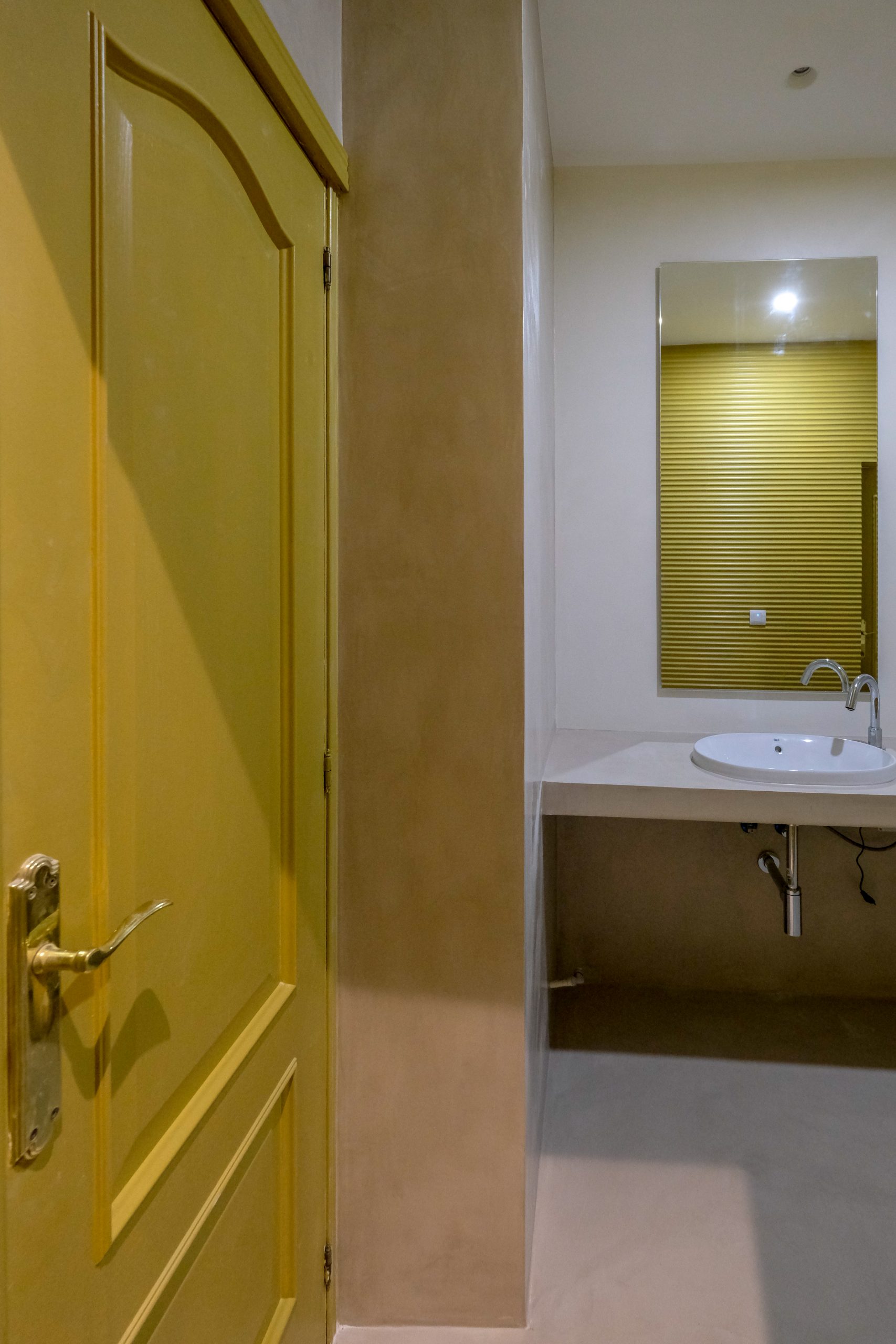 Actuación 3 Los Servicios. Ubicados en planta baja y segunda, ambos son utilizados por todos los usuarios de la planta, requerían una intervención inmediata ya que habían sido intervenidos en varios periodos y el eclecticismo era su regla. Se reorganizan y se revisten de paneles murales 3D pintados, que constituyen el foco dominante dentro del espacio, suelos y paredes continuas de microcemento, grandes espejos, nuevas piezas sanitarias y griferías para dotarlo de la elegancia perdida.