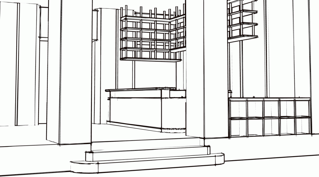 Actuación 1 La Cafetería. Diseño de barra como punto focal protagonista del espacio, pintura de paramentos en verticales y horizontales. cambio de iluminación a una cálida, reacondicionamiento de pavimento de terrazo existente, renovación de zonas trasera de apoyo de barra. A petición se incorpora el mobiliario existente a la propuesta agregando un fondo de vegetación y visillos a las ventanas.