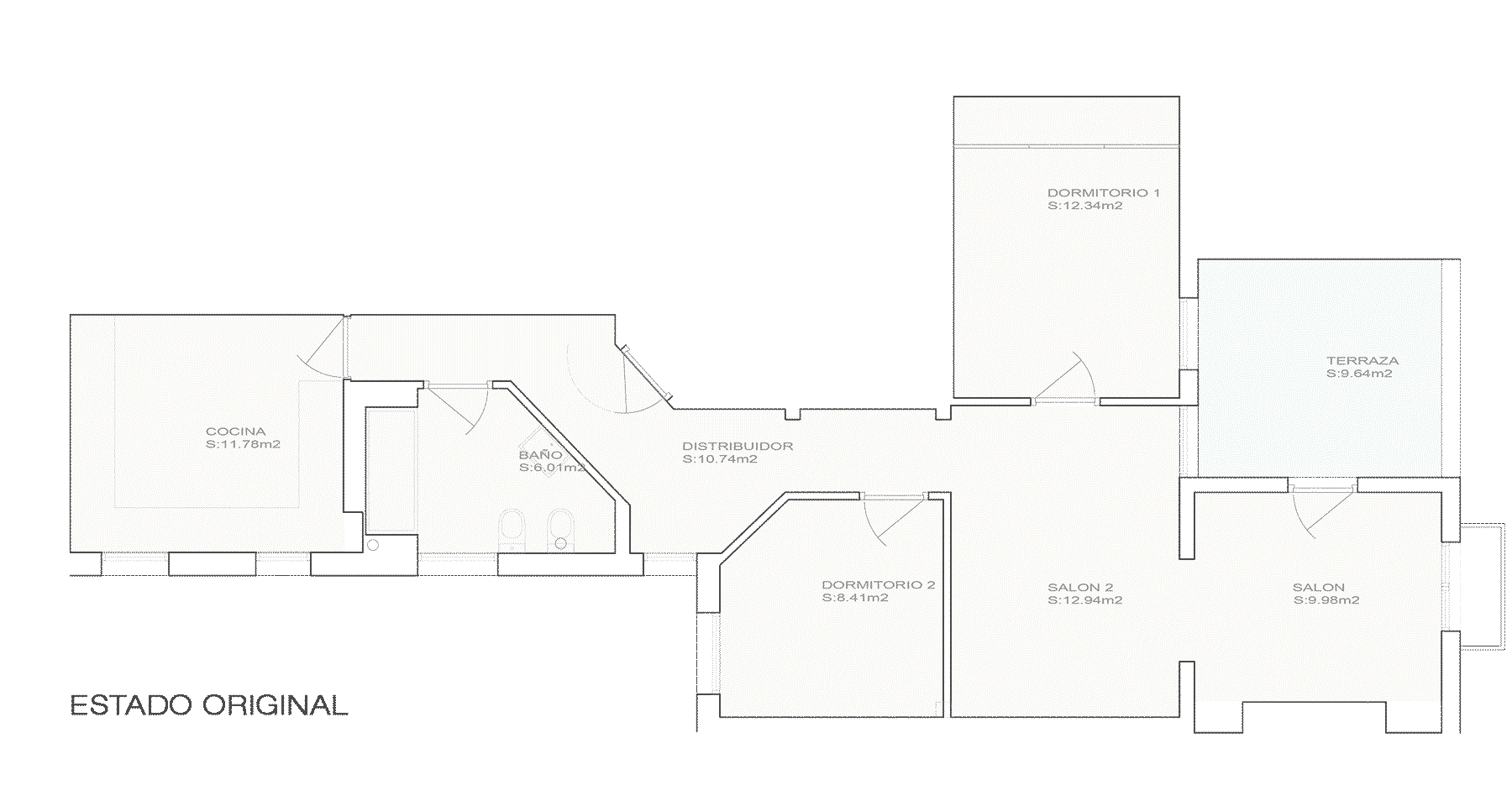 Se propone al cliente dividirlo en un apartamento de 50m2+10m2 (terraza), y un estudio de 25m2, independientes, con mayor rentabilidad y la posibilidad de uso por temporadas por su parte.